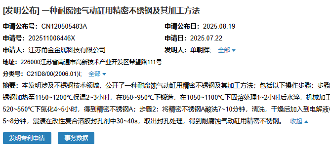 8月19日,江苏甬金金属科技有限公司成功申请一项名为“一种耐腐蚀气动缸用精密不锈钢及其加工方法”专利,申请公布号为CN120505483A,申请日期为2025年7月22日。