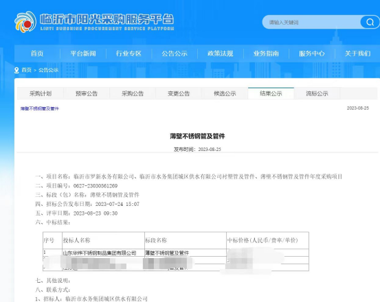 8月25日,临沂市阳光采购服务平台发布临沂市罗新水务有限公司、临沂市水务集团城区供水有限公司薄壁不锈钢管及管件年度采购项目招标结果,据显示,山东华烨集团成功中标。