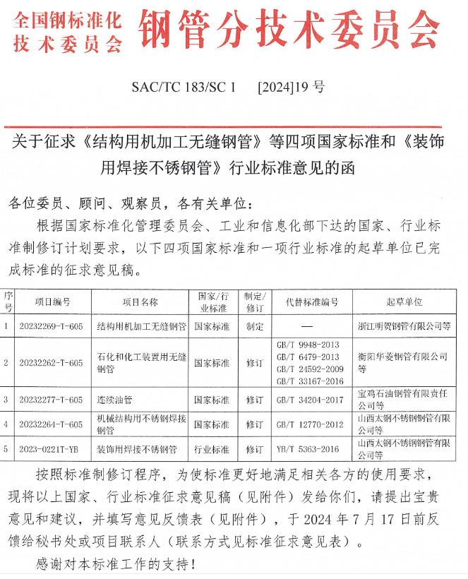 目前,由山西太钢不锈钢钢管有限公司等单位起草的国家标准《机械结构用不锈钢焊接管》、行业标准《装饰用焊接不锈钢管》已完成标准的征求意见稿。