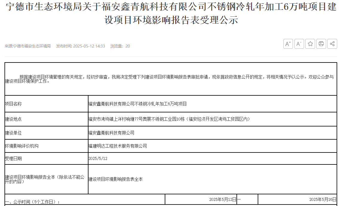 2025年5月12日,宁德市生态环境局受理福安鑫青航科技有限公司不锈钢冷轧年加工6万吨项目建设项目环境影响报告表并对外进行公示,公示期:5个工作日。