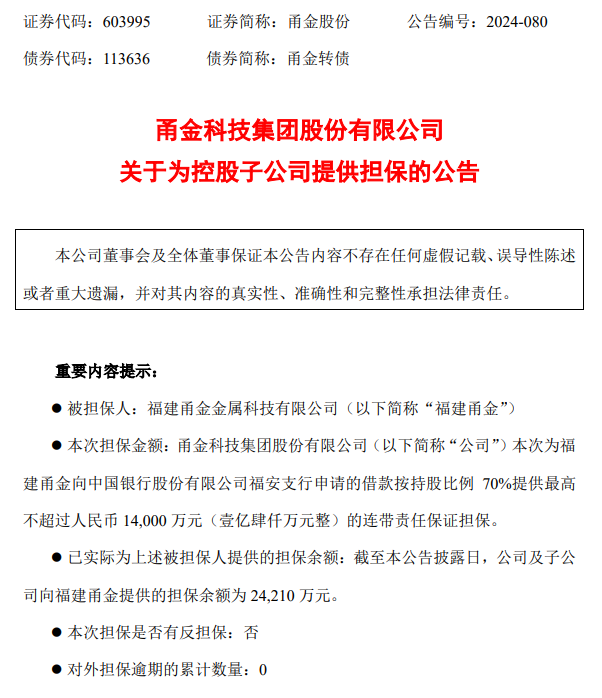 (来源:《甬金科技集团股份有限公司关于为控股子公司提供担保的公告 》)