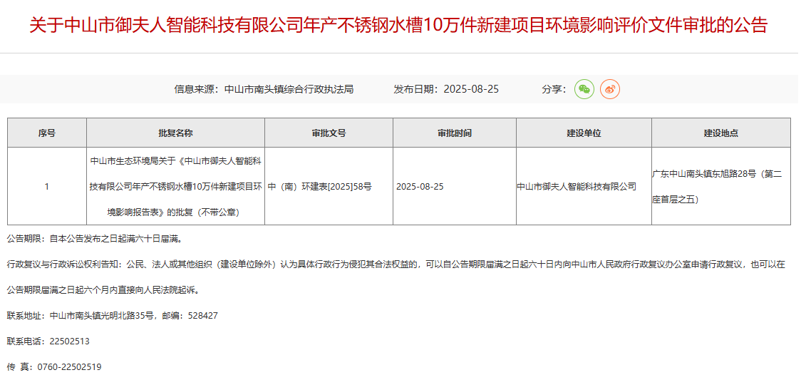 2025年8月25日,中山市南头镇综合行政执法局就中山市御夫人智能科技有限公司年产不锈钢水槽10万件新建项目环境影响评价文件作出审批意见并对外公告,公告期限:自本公告发布之日起满六十日届满。