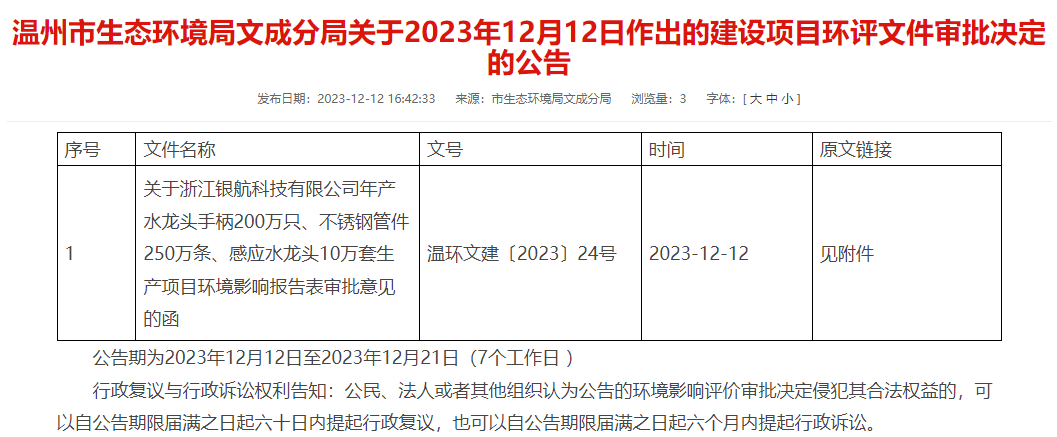 12月12日,温州市生态环境局文成分局就浙江银航科技有限公司年产水龙头手柄200万只、不锈钢管件250万条、感水水龙头10万套生产项目环境影响报告表作出审批决定并对外进行公告,公告期为2023年12月12日至2023年12月21日(7个工作日 ) 。
