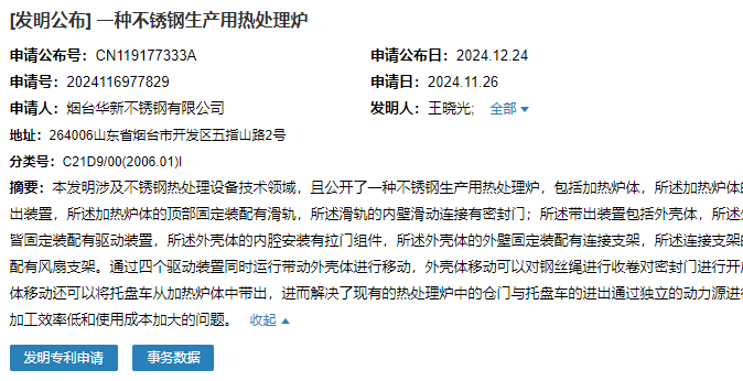 2024年12月24日,烟台华新不锈钢有限公司成功申请一项名为“一种不锈钢生产用热处理炉”专利,申请公布号为CN119177333A,申请日期为2024年11月26日。