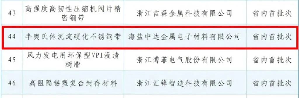 近日,浙江省经信厅公布了2024年度全省首批次新材料认定结果公示。百步经济开发区海盐中达金属电子材料有限公司的半奥氏体沉淀硬化不锈钢带榜上有名。