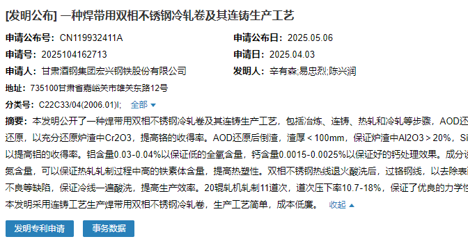 2025年5月6日,甘肃酒钢集团宏兴钢铁股份有限公司成功申请一项名为“一种焊带用双相不锈钢冷轧卷及其连铸生产工艺”专利,申请公布号为CN119932411A,申请日期为2025年4月3日。