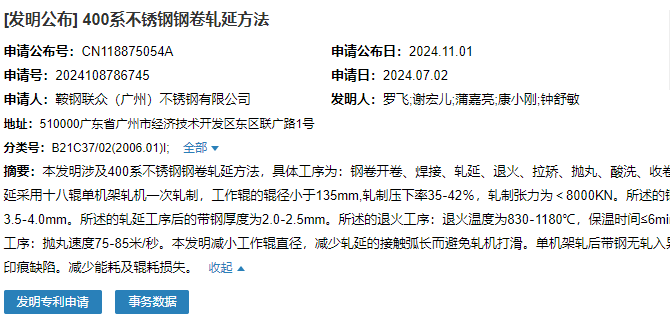 2024年11月1日,鞍钢联众(广州)不锈钢有限公司成功申请一项名为“400系不锈钢钢卷轧延方法”专利,申请公布号为CN118875054A,申请日期为2024年7月2日。